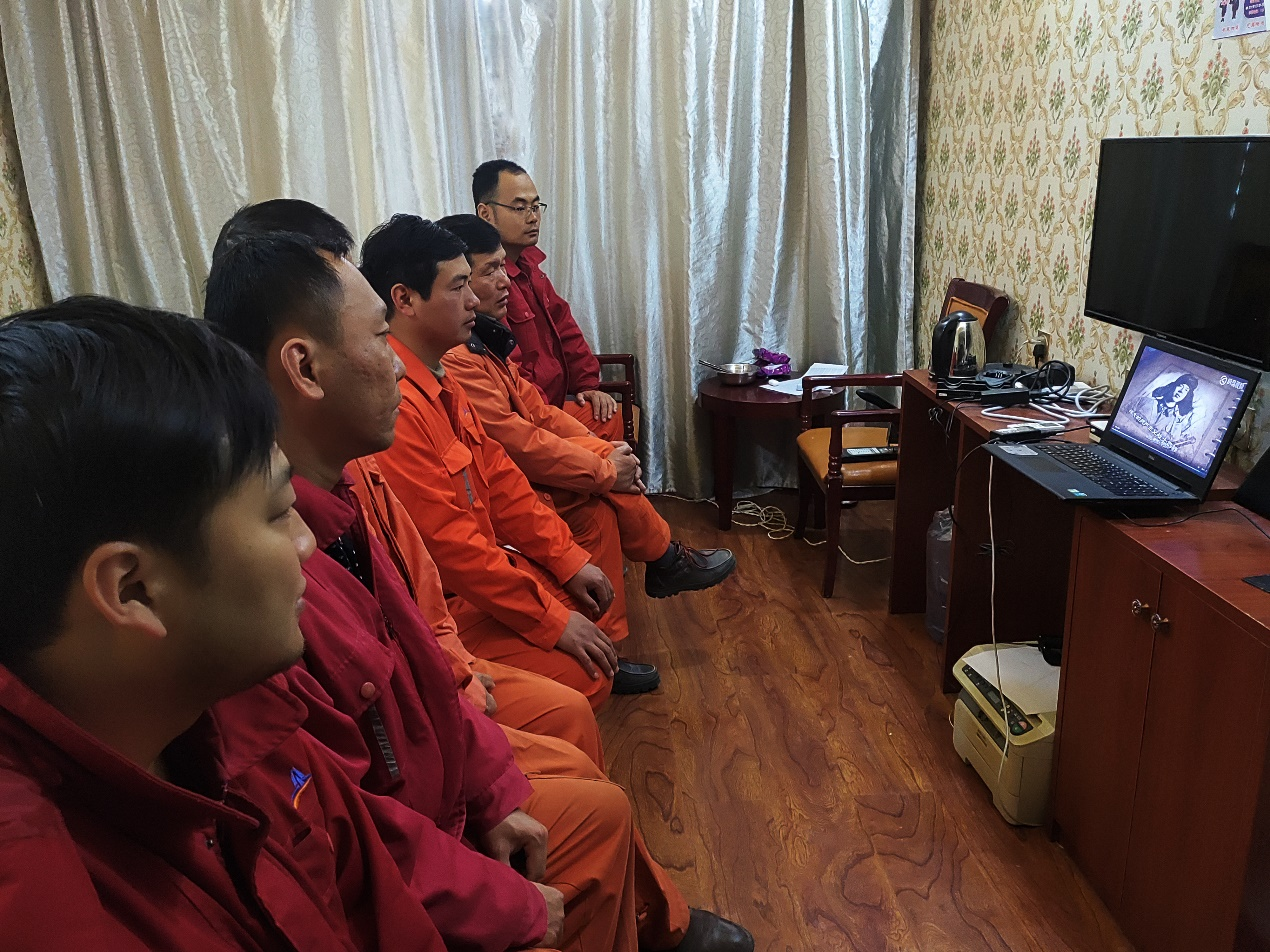 图为项目部职工观看雷锋事迹及雷锋精神记录影像