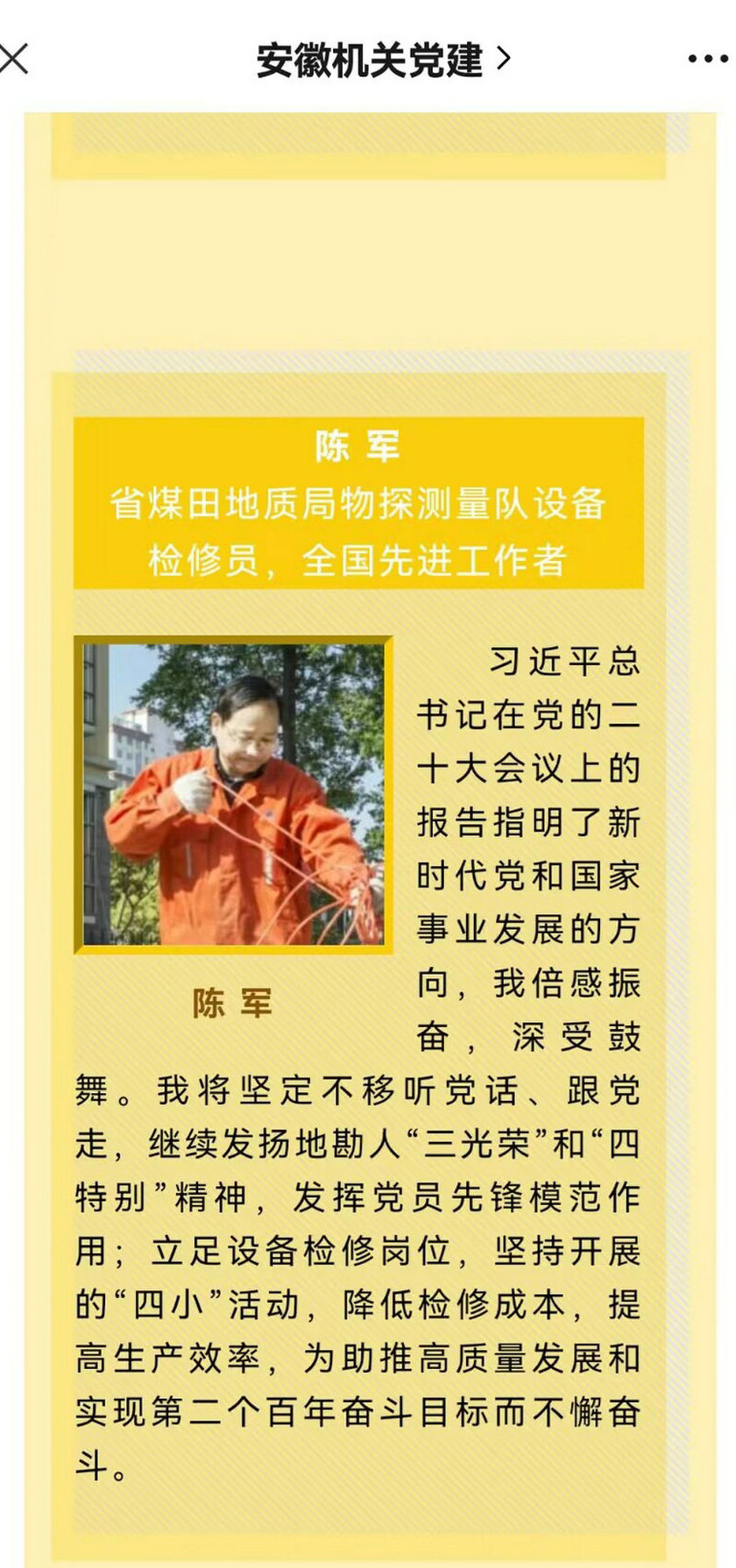 我队职工、全国先进工作者陈军撰写的二十大报告学习心得,由物测队推送到省煤田地质局,由局推送到省直机关工委,并与10月24日在安徽机关党建网“二十大•劳模谈”栏目发布,现将该栏目截图发布在队网站以便读者浏览。