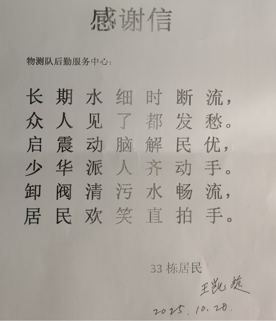 “长期水细时断流,众人见了都发愁。启震动脑解民忧,少华派人齐动手。卸阀清污水畅流,居民欢笑直拍手。”这首情真意切的打油诗,是物测队家属院33栋楼居民王凯旋代表全楼栋住户,为队后勤服务中心全体工作人员送上的感谢信。现在就让我们一起了解一下这份感谢信背后的故事。 时间回溯到10月10日上午10时,33栋楼居民王凯旋满面愁容地走进后勤服务中心主任李少华办公室。“李主任,我家最近水管的水流特别小,有时还不出水,做饭、洗衣服都不方便,你看能不能帮忙去看看什么情况?”群众的诉求就是工作的指令,李少华马上安慰说:“您不要着急,我这就喊水电班工作人员一起去你家里看看。” 李少华带着工作人员王启震来到王凯旋家中,果然情况如其所说一样。检查其家中进水阀、管道等并没有损坏,他们又询问了其他邻居,家中都存在水流过小的现象。王启震立刻判定是整栋楼的上水总阀出了问题。果然,检查总阀发现,已出现老旧损坏情况,阀芯更是被杂质堵塞,导致供水不畅。找准问题症结后,水电班同志们分工负责,马不停蹄地投入到抢修工作中,不仅更换了损坏的阀芯,对供水管道进行了疏通处理,还主动为楼内每户居民的水龙头进行了彻底清洗,在确定水压正常后才离开现场。整个抢修过程高效快捷,既保证了施工质量,又最大限度减少了对居民正常生活的影响。 10月20日下午3时,王凯旋再次走进李少华办公室,这次是笑容满面的送上了一封感谢信。“你们真是帮我们解决了大问题啊!现在家里水压足得很,用水再也不用发愁了,我代表我们全楼的居民感谢你们!”李少华和后勤服务中心的同志们也一起表达了对王凯旋及33栋楼全体居民的感谢。“这都是我们应该做到,能服务好你们并得到你们的表扬,这就是对我们工作最大的鼓励,我们也要谢谢你们啊!” 这封沉甸甸的感谢信,字里行间饱含着居民对后勤服务中心全体工作人员及时、快捷、高效工作作风的赞誉,也是后勤服务中心在队党委领导下,持续推进“我为群众办实事”实践活动的最好佐证。