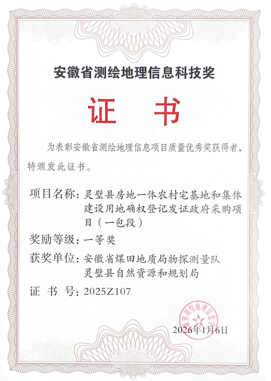 近日,安徽省测绘地理信息科学技术奖评选结果正式揭晓,由物测队测绘技术研究院承揽实施的灵璧县房地一体农村宅基地和集体建设用地确权登记发证项目凭借过硬质量与优异成效,荣获安徽省测绘地理信息项目质量优秀奖一等奖。 灵璧县房地一体农村宅基地和集体建设用地确权登记发证项目是服务乡村振兴、规范农村产权管理的重要民生工程。物测队测绘技术研究院严格落实省、市、县关于农村不动产“应调尽调、应发尽发”工作要求,为当地农村产权制度改革、宅基地管理和乡村治理提供了精准可靠的测绘地理信息保障。项目实施期间,测绘技术研究院高效完成像控点布设4168个、权籍调查测绘61081宗、农村不动产登簿发证40390宗,全面实现合同约定各项目标任务。 该项荣誉的获得充分彰显了物测队在测绘地理信息领域的技术实力、质量管控水平和项目履约能力,是对全体技术人员专业素养与实干作风的高度肯定。 下一步,物测队测绘技术研究院将以此为契机,持续深耕测绘地理信息主业,不断加大人才培养、技术创新、装备升级和管理提升力度,健全质量管控与服务保障体系,全面提升核心测绘能力与综合服务水平,奋力推动测绘地理信息工作提质增效、提档升级,为物测队高质量发展贡献更大力量。