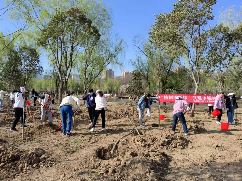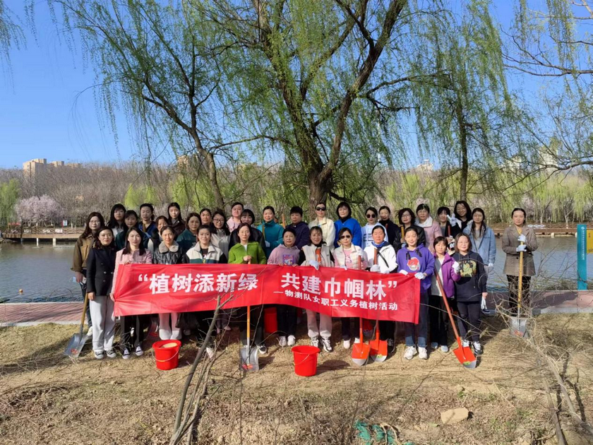 为深入贯彻习近平生态文明思想,引导和激励广大妇女职工增强生态文明意识、践行生态文明理念、美化绿化生态环境,建设绿色、低碳、生态家园,以实际行动为建设美丽宿州贡献巾帼力量,物测队工会联合宿州市妇联、市林业局开展“植树添新绿 共建巾帼林”的植树活动。 3月14日上午,物测队40余名女职工带着铁锹和水桶来到宿州市沱河东岸乐湖公园西侧,在工作人员的指导下,紧张有序开展植树活动。大家不怕苦不怕累,分工合作,有的挖坑、有的扶苗、有的浇水......大家干劲十足,现场气氛非常活跃。 本次活动,共栽种120棵树苗。大家心中期盼小树茁壮成长,为美化生态环境添一片新绿。