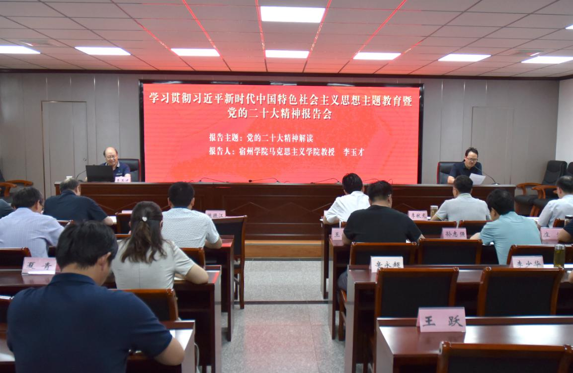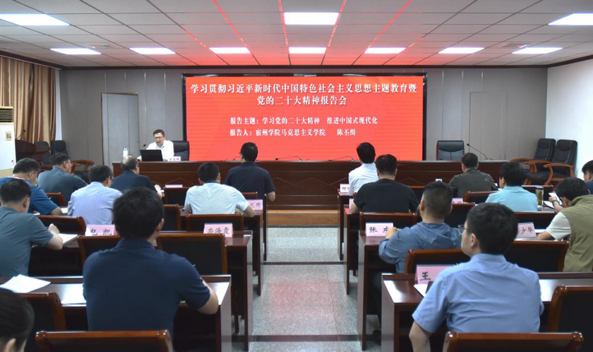 6月9日,物测队举办学习贯彻习近平新时代中国特色社会主义思想主题教育暨党的二十大精神报告会。邀请宿州学院马克思学院教授陈丕缉、李玉才授课。队班子成员、机关党总支专职副书记、各党支部书记、全队副科级以上干部、专职组织员38人参加会议。 上午,陈丕缉教授以《学习党的二十大精神 推进中国式现代化》为题,重点结合党的二十大报告中提出的“以中国式现代化推进中华民族伟大复兴”,详细阐述了中国式现代化的本质要求,及其具有的鲜明中国特色。